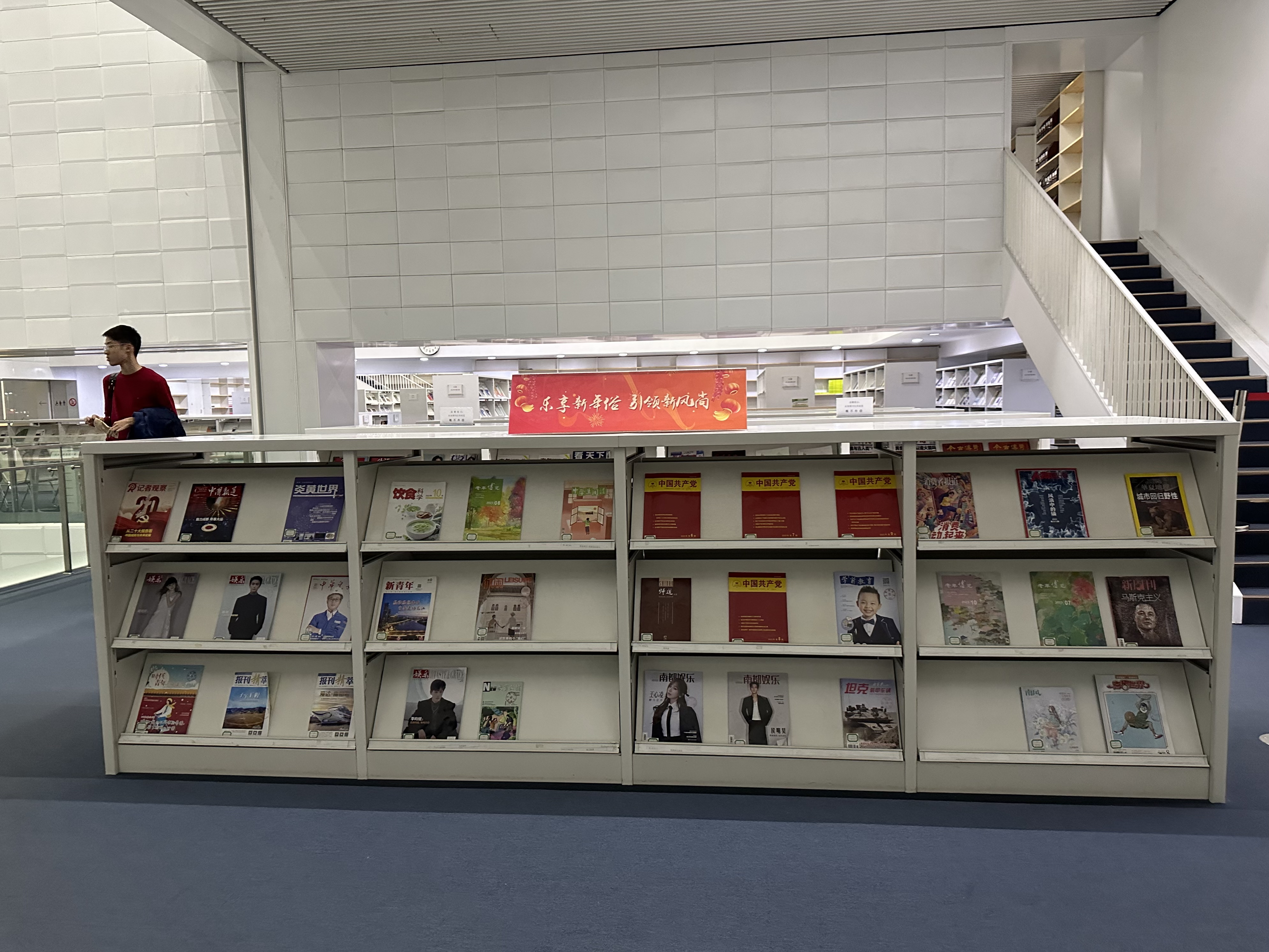 伴随着滴滴的扫码声响,二楼期刊借阅区的手工借还刊工作有条不紊地开展着,工作人员以饱满的热情为读者介绍借阅规则,解答各类咨询并推介天图的新春文化菜单。走进借阅区,“乐享新年俗 引领新风尚”主题刊展映入眼帘,读精品期刊,在文墨飘香里感受年俗文化。借阅区内共3000多种期刊分类陈列,徜徉在知识的海洋里细细翻阅,静享温馨的阅读夜!