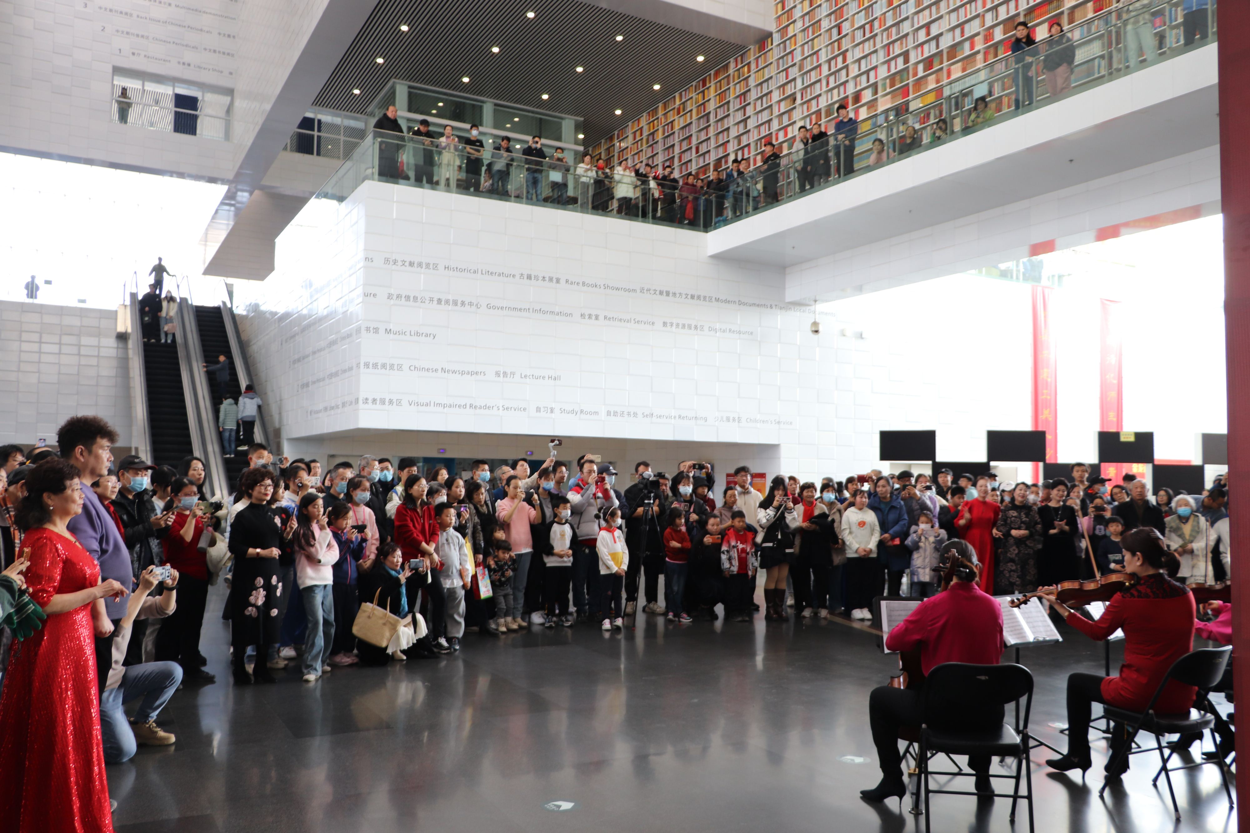 春日暖阳,当熟悉悠扬的旋律在书架间流淌,一首《我和我的祖国》瞬间吸引了座位上、书架前、步履徘徊间的众多读者,大家纷纷寻声望去、闻声前往,迅速从四面八方聚集到一楼大厅。热烈的开场曲《新春乐》欢欣鼓舞、喜气洋洋,一下子把现场奏响新春的浓烈氛围在人群中燃了起来!当《我和我的祖国》再次悠然响彻全馆,优美的旋律、真挚的情感引起了大家的强烈共鸣,现场频频爆发出热烈的掌声!