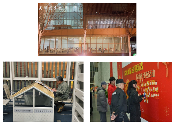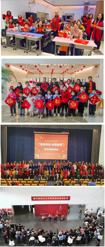 大年初一早上9:00,天津图书馆党委书记李冠龙率工作人员,在文化中心馆区一楼大厅恭候龙年第一批到馆读者,向读者拜年,致以新春的问候,并赠送天图精心准备的新年文化大礼包。“我在天图读古籍•我在天图修文物”系列亲子体验活动、非遗传承体验基地打卡活动、《非物质文化遗产的传承与传播——从剪纸艺术看春节》海津讲坛,增强读者对非物质文化遗产的认同感,让非物质文化遗产在当代焕发出更加绚丽的光彩。《2018柏林爱乐除夕音乐会》蓝光精品赏析、《中国近现代经典钢琴作品的创作风格与特点》音乐大讲堂、龙耀津门新春室内音乐会、“交响润书香”快闪活动在图书馆轮番上演,带给读者一场场沉浸式的视听盛宴,让音乐与书香完美结合。“醒狮闹新春 欢喜过龙年”、“创意灯彩绘 共庆团圆时”等少儿体验活动,让小读者们在图书馆里寻年趣、赏年俗、品年味、过大年,感受书香文化,乐享智趣春节。“诗启祥龙 吟贺新春”新年诗歌朗诵会、“龙腾盛世 九州同颂”2024年新春留声活动,用声音传颂经典,用书香沁润新年。读经典 赏楹联 迎新年丨在传统文化中“阅见美好”、“飞龙迎春 一路向福”春节大闯关、“赏烟火天津 过欢喜大年”2024年新春答题活动、“书香年夜 吟贺新春”云端共度书香节、“龙腾瑞气 祈福新年”24字原创写作大赛等线上活动为读者提供丰富多彩的文化大餐。