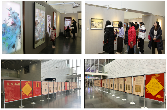 由天津工艺美术职业学院党委与天津图书馆党委联合推出的“於此乾乾——工美·天图党委共建甲辰新春艺术作品展会”运用文物虚拟活化手段与裸眼3D交互投影媒体产品,将静态的古籍、画作以三维形式呈现在观众面前,让古籍、书画“活”起来,打造沉浸式体验,让读者在互动中深刻理解和感受文化的魅力。为营造更加浓厚的新春氛围,正月初六,天津工艺美术职业学院师生在天图文化中心馆区一楼现场挥毫,进行书画创作,一幅幅书画作品表达了工美师生和天图馆员对广大读者朋友们的美好祝福,翰墨的清香与读者的欢笑,让浓浓的“年味”再添新彩。“龙吟书香——甲辰新春贺岁展”分为“龙之历书”“龙之形貌”“典籍载龙”三个部分,向观者分享了和“龙”相关的传统文化知识。“乐享新年俗 引领新风尚”主题刊展,读精品期刊,在文墨飘香里感受年俗文化。“廉韵图书角”一经推出即受到了读者们的欢迎,许多读者在内容丰富的主题图书前驻足翻阅,兴致盎然地仔细品读,从中感受着廉洁文化的陶冶。“绘本润童心,好书伴成长”主题绘本展、“知识伴成长,童心耀未来”科普知识展在梦娃绘本馆陪伴读者过新年。