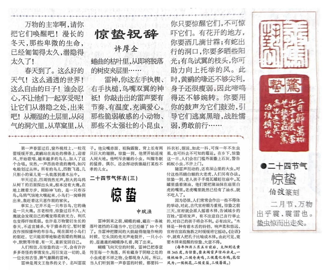 文1 《惊蛰祝辞》及《二十四节气 惊蛰》篆刻 摘自《今晚报》2018.03.05第09版