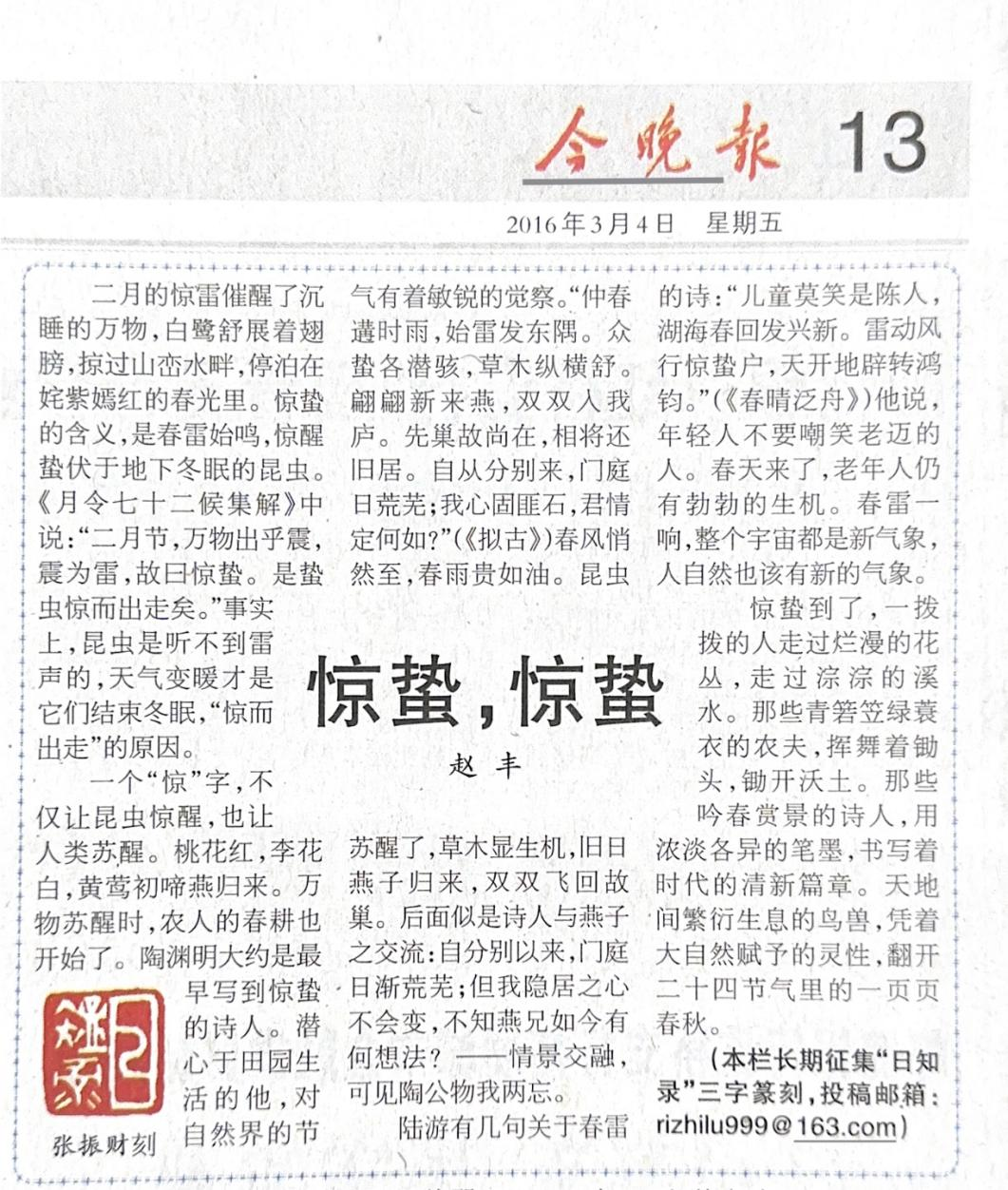 文《惊蛰,惊蛰》摘自《今晚报》2016.03.04第13版