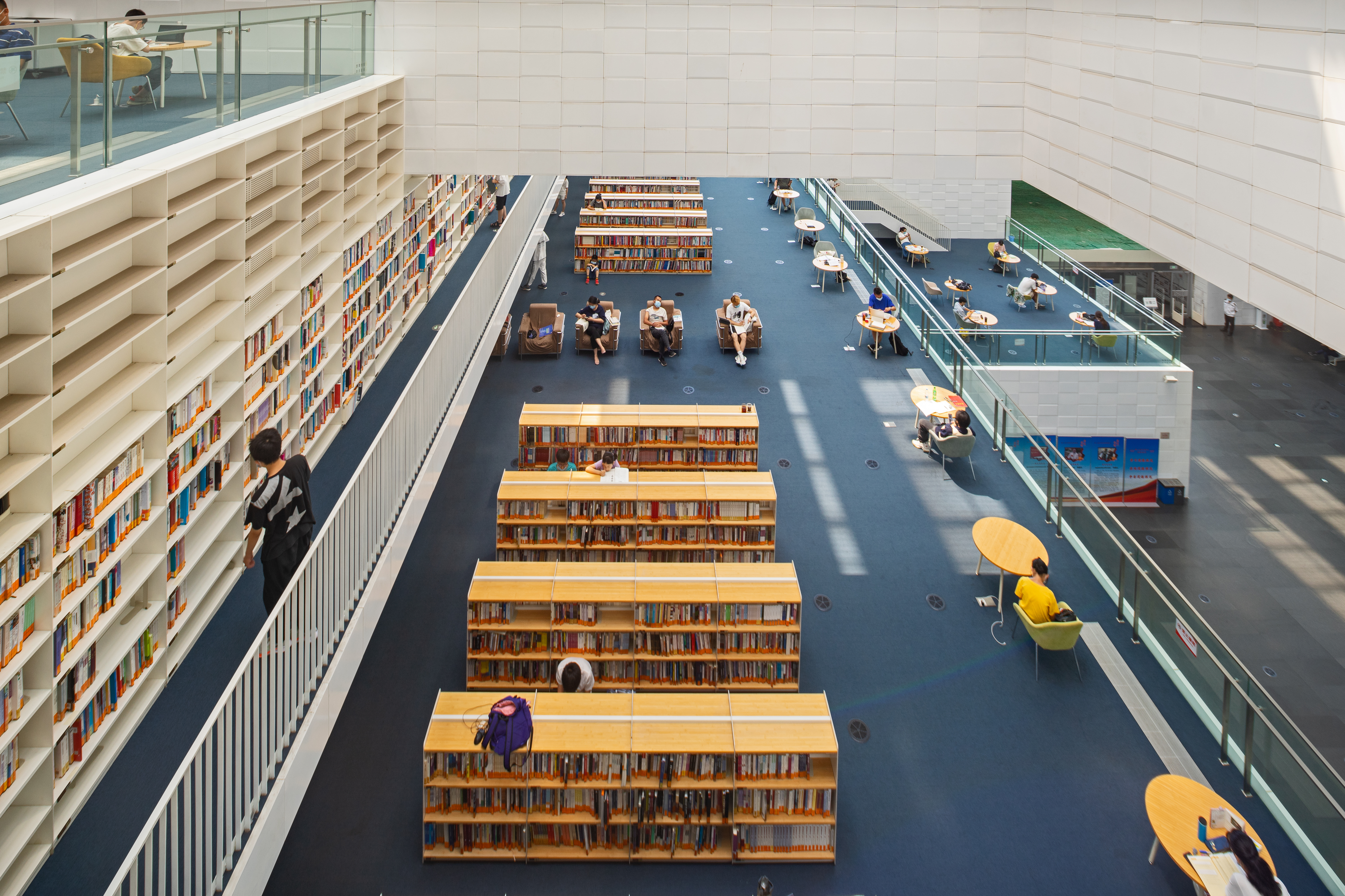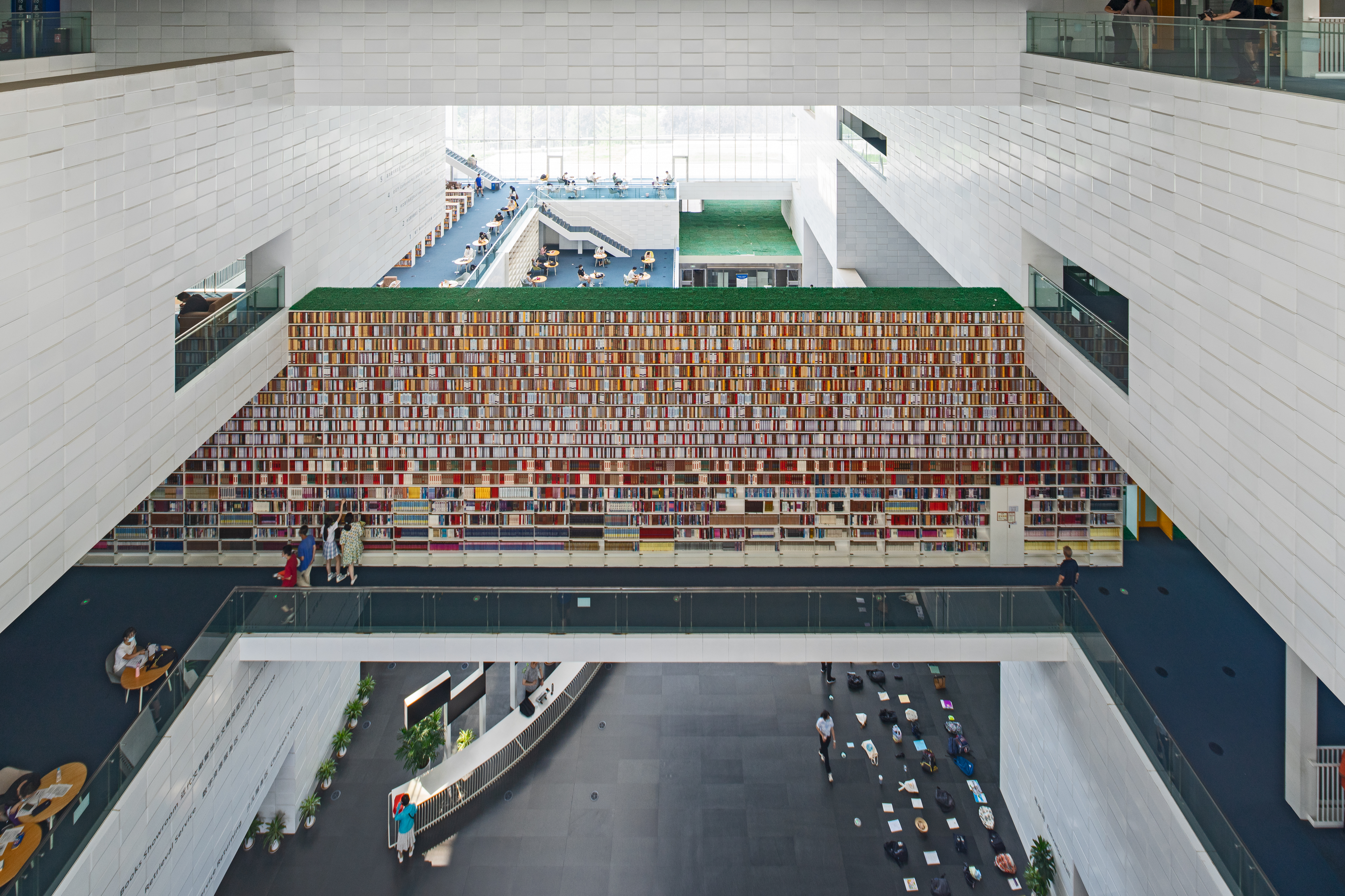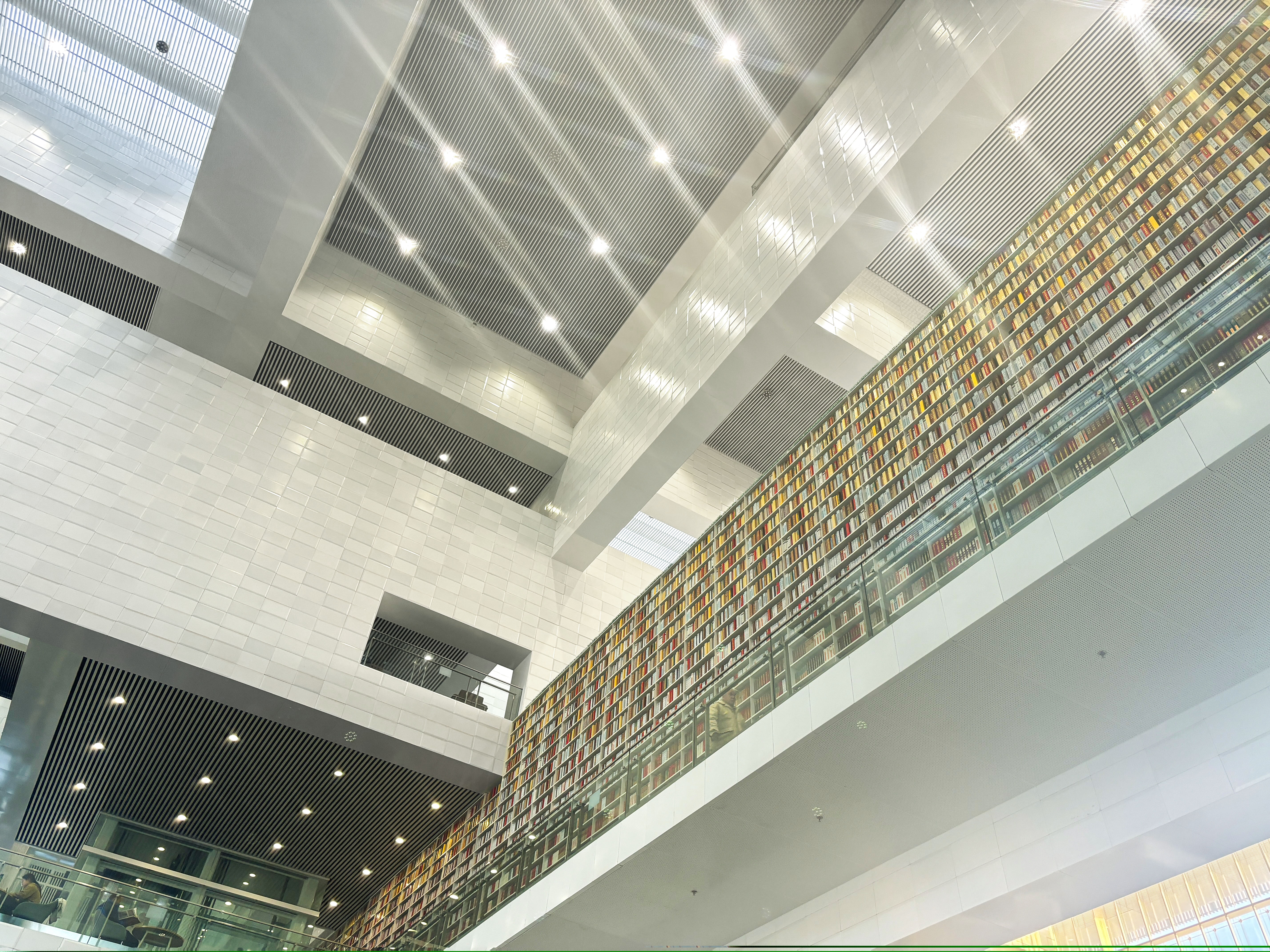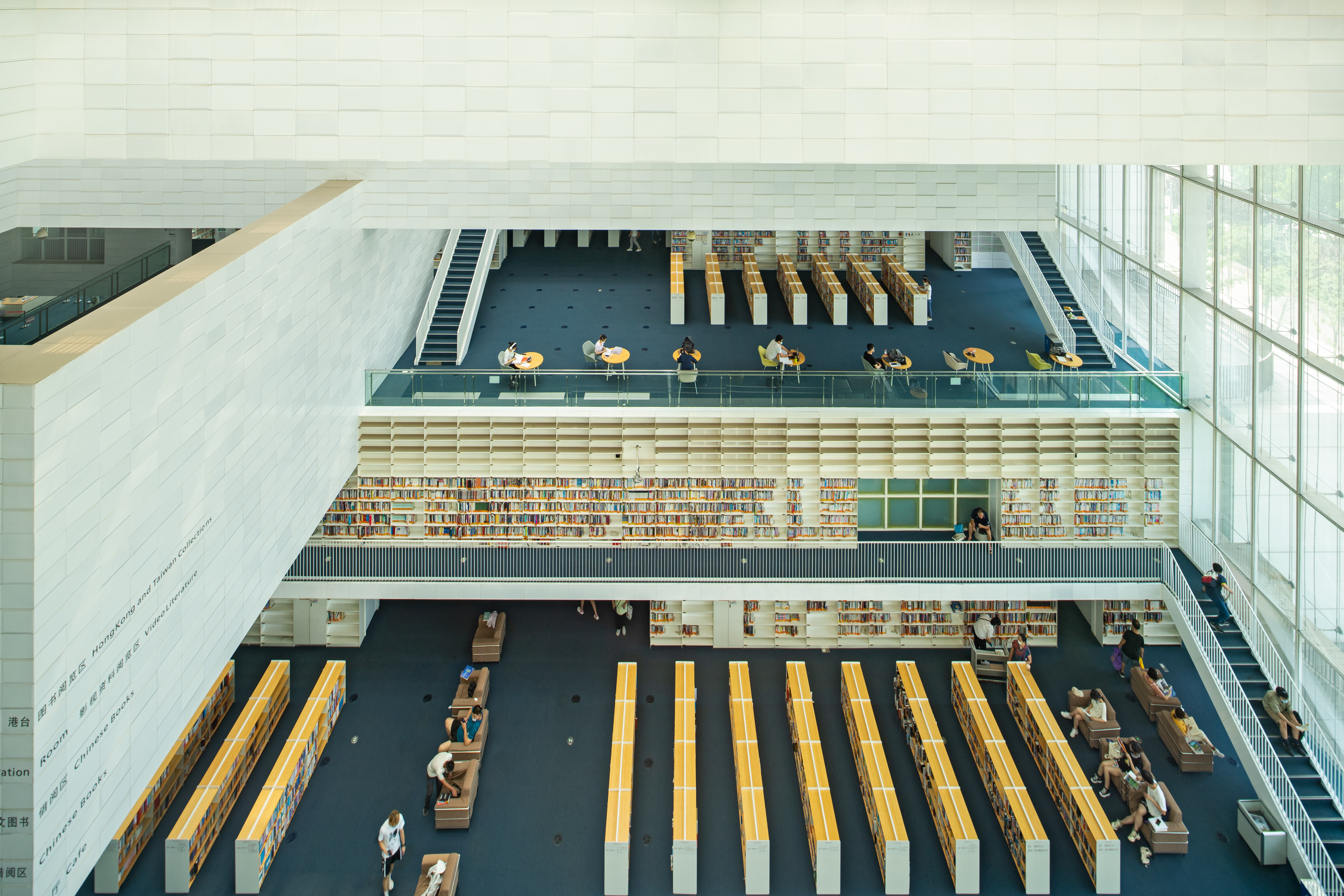 图书馆的外表皮采用石材百叶,除满足抵御大风的现实需求,还保持了立面的通透性,由此产生的柔和光线,营造出温馨的阅读氛围。建筑设计上提供了最大程度的通达性,由入口大厅贯穿南北,形成通廊式共享空间,以两个开放的大型入口与北侧湖畔广场、南侧城市空间相互连通。五个楼层交汇而成的中庭空间,各设有一个夹层,结合阅览功能设置了七个采光中庭,建筑梁壁纵横交错、盘旋而上,丰富的馆藏资源则巧妙地嵌入式安放在书架上,整体看上去,仿佛书籍悬浮于空中,展现出开放、便利、包容的设计理念。灰白纵深交错的建筑结构给人艺术视觉的享受,光影和书香的世界带来可贵的平静与淡然。置身图书馆,因建筑设计之美而吸引,因开卷有益而驻足。