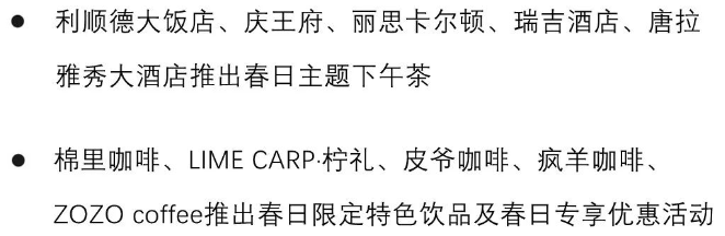 ·西式大餐:万丽天津宾馆浓舍西餐厅、利顺德1863别致西餐厅、马克西姆餐厅、成桂西餐厅、起士林大饭店、OTF加州餐厅、塞纳河法国餐厅、鹿园西餐等全市各大西餐厅均将推出春季限定菜品以及主题优惠活动