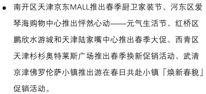 ·2024全国消费促进月暨京津冀消费季,整合商旅文体资源,围绕满足京冀游客来津旅游、观光、购物、休闲等多样化需求,打造有颜值、有品质、有特色的消费场景。重点结合春季踏青、国货潮品、文化体验等消费主题,展现京津冀协同发展日益焕发的生机活力、推动高质量发展和创造高品质生活的成果。