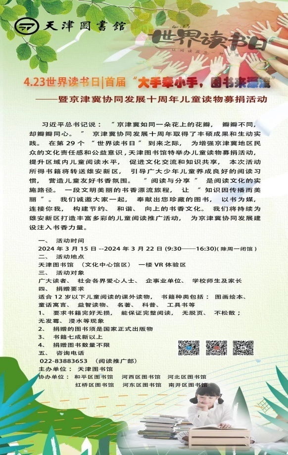 习近平总书记说:“京津冀如同一朵花上的花瓣,瓣瓣不同,却瓣瓣同心。”京津冀协同发展十周年取得了丰硕成果和生动实践。在第29个“世界读书日”到来之际,为增强京津冀地区民众的文化责任感和公益意识,天津图书馆特举办儿童读物募捐活动,提升区域内儿童阅读水平,促进文化交流和知识共享,本次活动所得书籍将转送雄安新区,引导广大少年儿童养成良好的阅读习惯,营造儿童友好书香氛围。“阅读与分享”是阅读文化的实施路径。一段文明美丽的书香漂流旅程,让“知识因传播而美丽”。我们诚邀大家一起,奉献出您珍藏的图书,以书为媒,连接你我,构建节约、和谐、向上的书香文化。我们将持续为雄安新区打造丰富多彩的儿童阅读推广活动,为京津冀协同发展建设注入书香力量。
