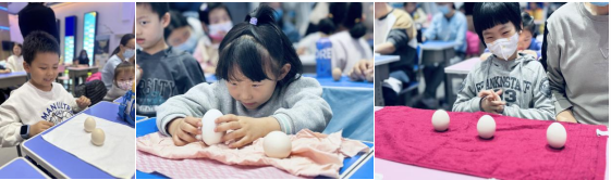 随后,小读者们拿出准备好的鸡蛋,开始体验故事中的“竖蛋”游戏。“春分竖蛋”是中国民间的传统习俗,民间有“春分到、蛋儿俏”的说法,以庆祝春天的来临。小读者们找到平整的桌面,均匀摇晃鸡蛋,将鸡蛋大头朝下,小心放好。经过多次尝试,一颗颗鸡蛋在桌面上稳稳地立起来。