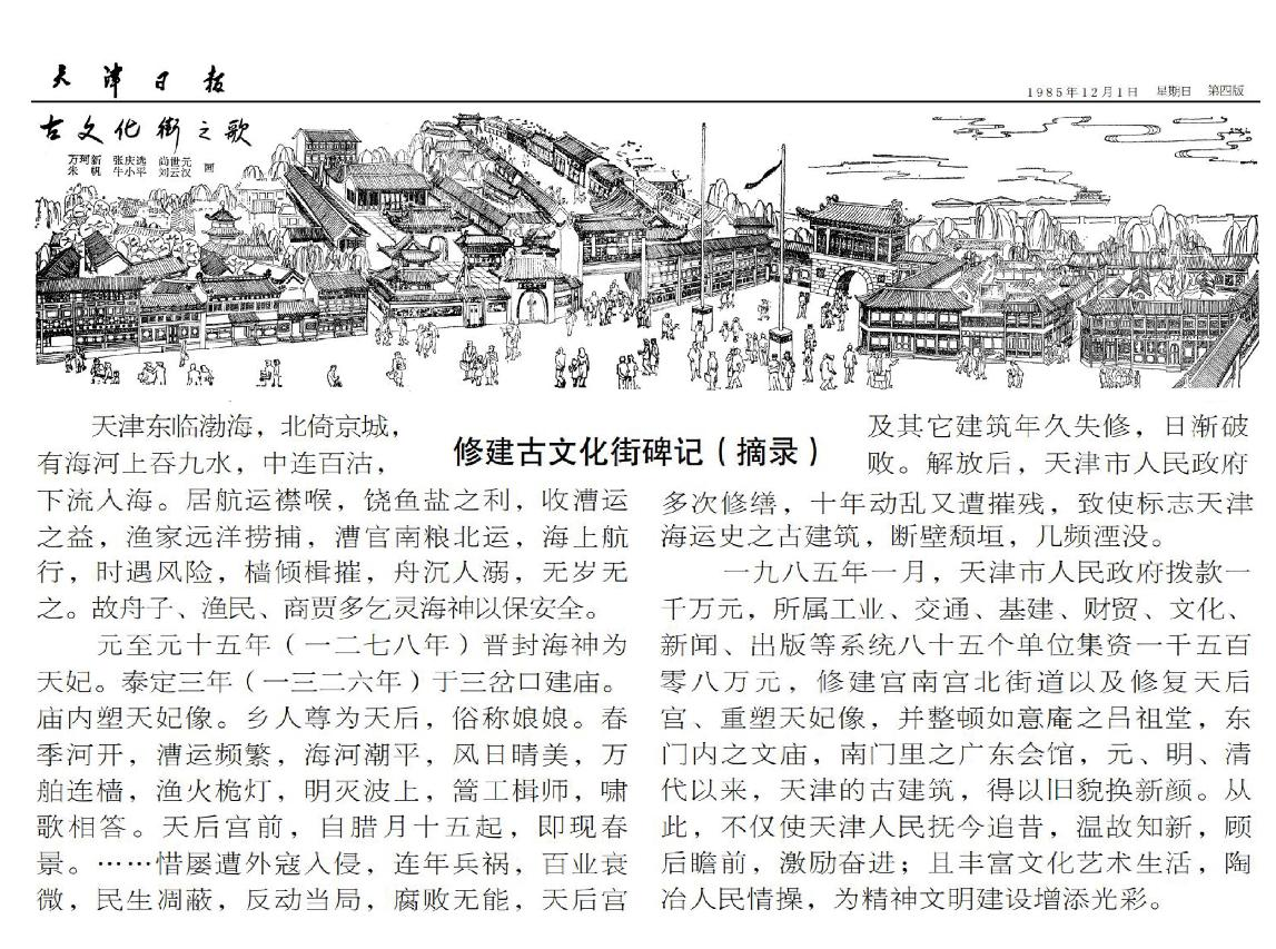 图《古文化街之歌》文《修建古文化街碑记》(摘录)摘自《天津日报》1985.12.01第04版