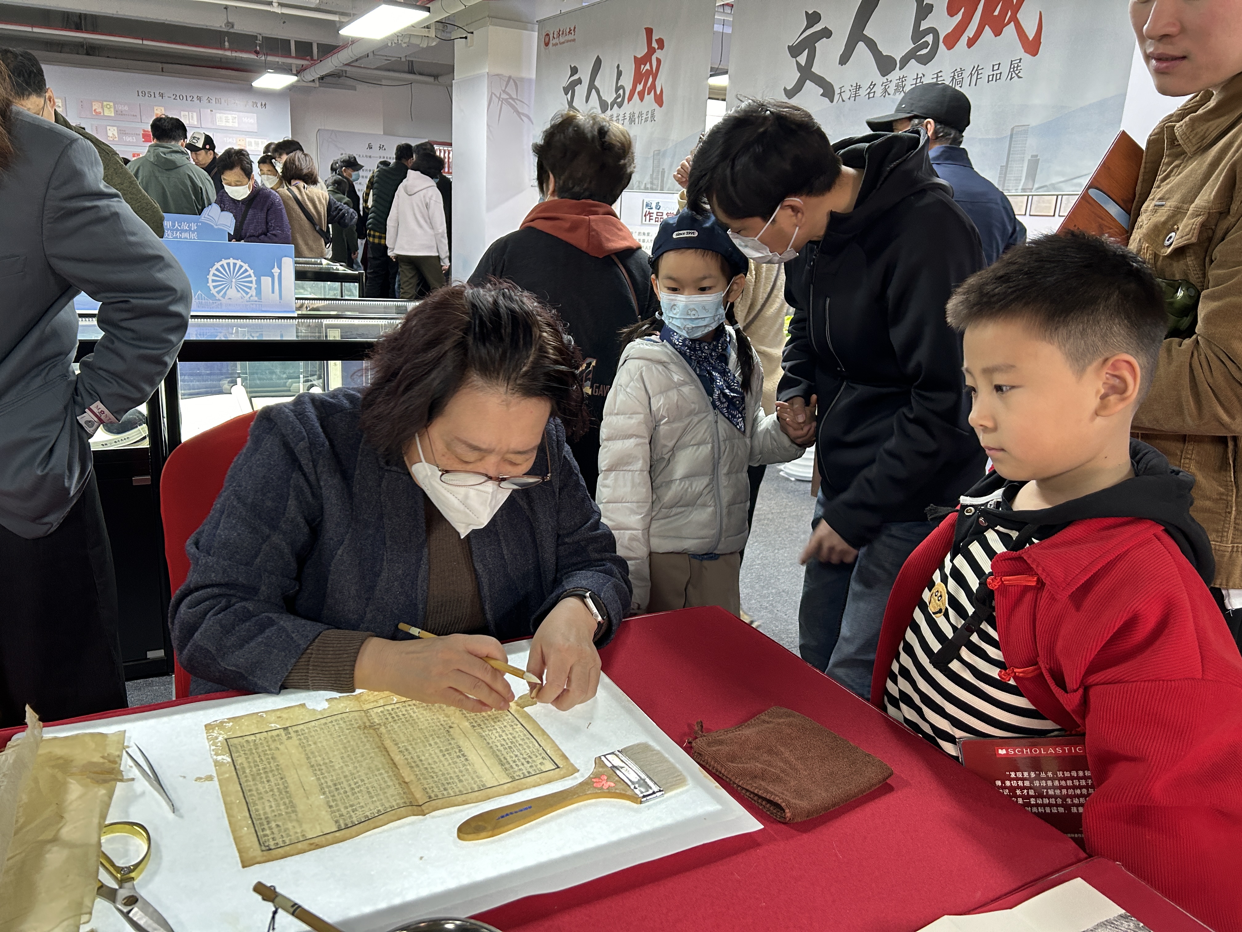 天津图书馆古籍修复技艺是国家级非物质文化遗产代表性项目。在此次天津图书馆历史文献展览区旁,专设“古籍修复技艺”展示区。以国家级非遗技艺为依托,由国家级非遗传承人万群老师带领天津图书馆古籍修复团队,现场向市民朋友们展示古籍修复技艺。活动现场吸引诸多市民驻足,大家对“古籍修复”这一古老的非遗技艺产生了浓厚的兴趣。市民朋友们通过现场观看古籍修复师的技艺展示,拉近了与古籍的距离,充分体会到了古籍保护的严谨性和重要性,从而激发大众对古籍文献及优秀传统文化的热情。