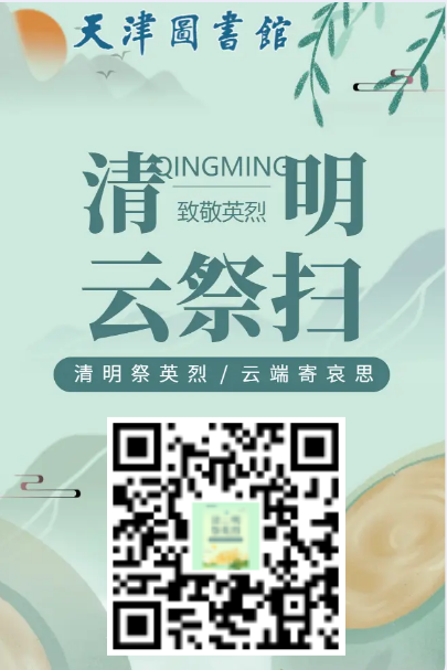 爱意随春风蔓延,心有眷顾追忆往昔。在这缅怀故人、寄托哀思的时节,为培育践行社会主义核心价值观,弘扬中华优秀传统文化,营造安全、有序、文明、和谐的良好祭扫氛围,天津图书馆团委组织开展“清明祭英烈 云端寄哀思”活动,邀您一起线上“云祭扫”。您可以通过扫描识别下图二维码,通过网上祭奠、网上献花,抒写感言寄语,表达对英烈的崇敬之心、感念之情、传承之志。