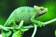 变色龙身怀绝技,变色、动眼、吐舌是它经常表演的3套绝活。变色龙行动十分迟缓,却有着灵活的眼睛和舌头。变色龙长着两只藤壶型的眼睛,左右眼球会分别转动360°,可以单独活动。也就是说,当变色龙的一只眼睛向前方看时,另一只眼睛可以朝后看,做到环视八方。变色龙的舌头极长,是身体的2倍,平时如钟表发条那样盘卷在嘴里,当它发现猎物时,便突然伸直长舌,以舌捕食,快如闪电,如探囊取物。变色龙最拿手的绝活儿就是变色。它皮肤的基本颜色是绿色,这便于它们隐于树上,但可以随时变出深绿、浅绿、紫、蓝、褐色等,甚至可以变出各色相间“花里胡哨”的花纹色。