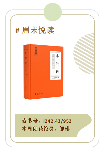 《水浒传》取材于北宋末年宋江起义的故事,最初流传于民间,经由说书人创作为话本,再经元杂剧水浒戏的铺叙,至施耐庵创制为一百零八个头领聚义梁山泊、对抗奸佞的长篇白话小说。这一百零八人有的是朝廷官吏,有的是绿林草莽,有的是名将之后,有的是饱学之士,有的是市井小民,有的是豪门富户,他们扶危济困、仗义疏财,演绎出一部豪气干云的英雄传奇。天津图书馆品读经典系列在接下来的三周里,将精选不同版本的《水浒传》,连续三期为大家推送书中各个经典桥段,带您从不同角度靠近名著,感受阅读的魅力。