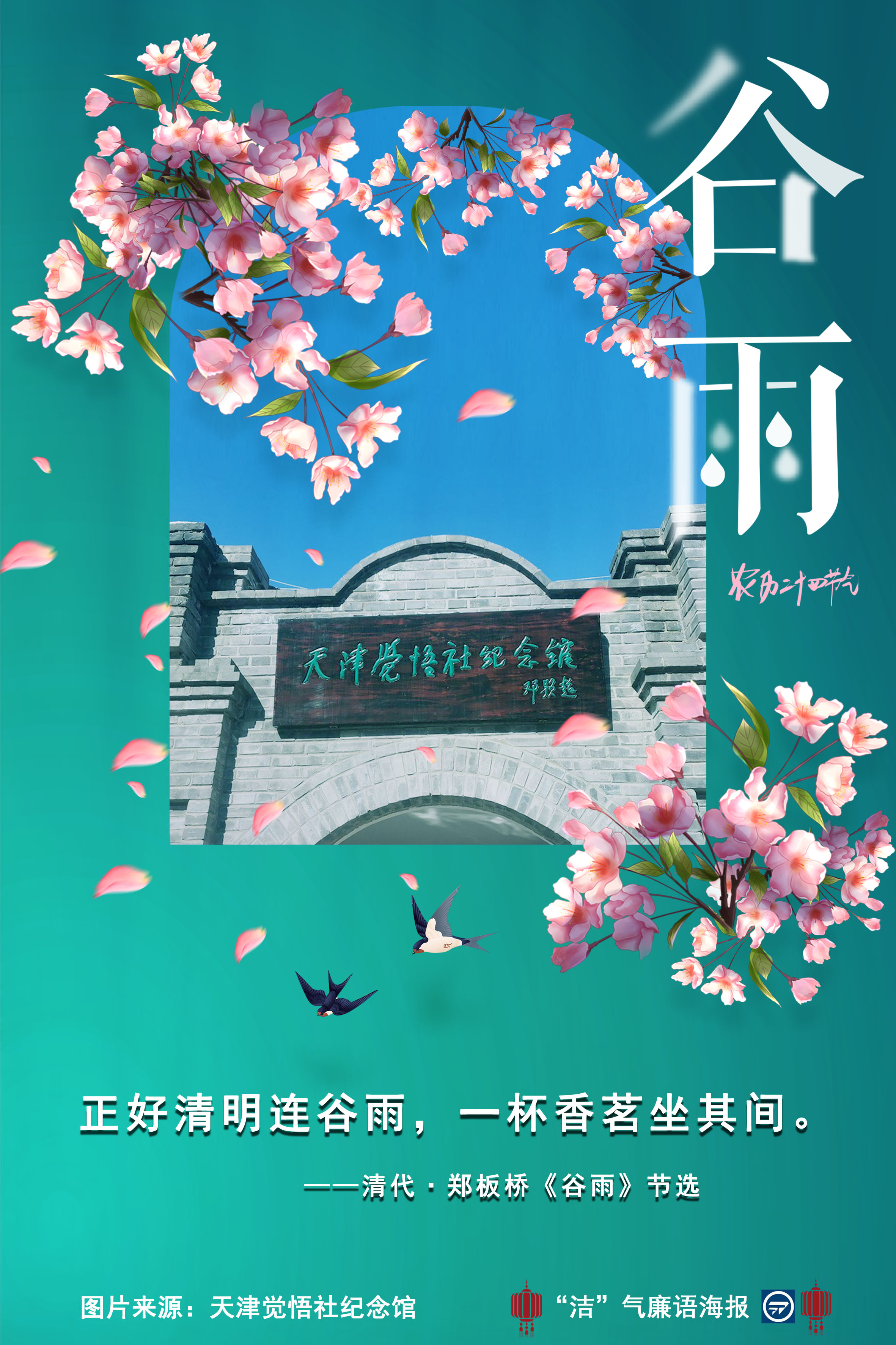 明日谷雨丨天津图书馆“守节气 扬正气”——“洁”气廉语海报