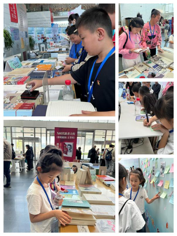 世界读书日期间,操场河村学生团队前来观摩选书大会现场,参与集章打卡带来的乐趣,在留言板上写下对选书大会的感言,并合影留念。图书馆馆员带领同学们参观了成人和少儿选书大会现场、图书阅览区、文创商店等,聆听了音乐图书馆美妙的乐曲,近距离接触了古籍修复技艺,在潜移默化中激发了同学们的阅读热情。