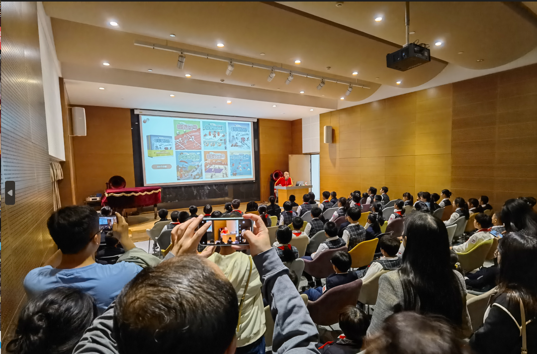 王喆根据学生们的年龄特点,用通俗易懂的语言、有趣的互动问答形式,分享了书中的各种体育项目与体育知识。特别是,他结合亲身经历,生动地讲述了中国女排辛苦训练、顽强拼搏、为国争光的故事,激发了小朋友们对体育运动的强烈兴趣,感受“祖国至上、团结协作、顽强拼搏、永不言败”的女排精神,现场气氛十分活跃。