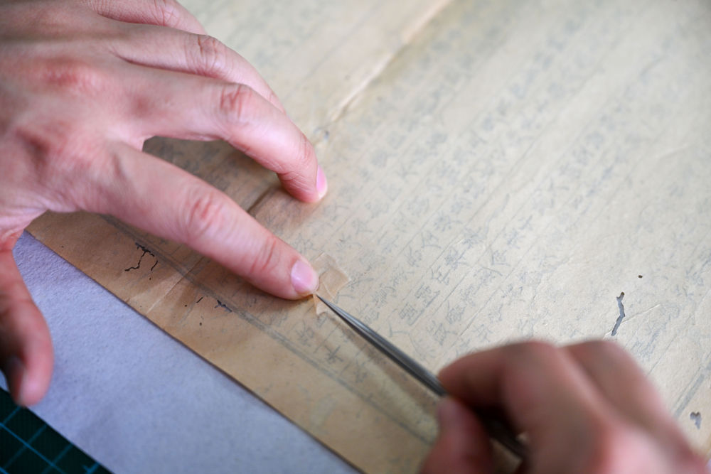天津图书馆的古籍修复师用补纸在古籍背面进行修复作业。新华社记者 孙凡越 摄