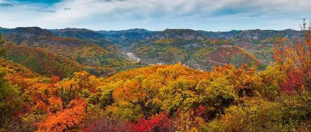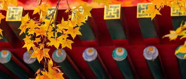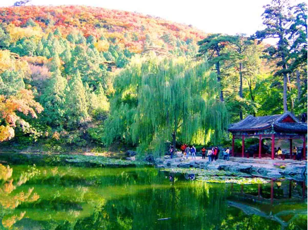 玉华岫:静宜园二十八景之一,位于香山的半山腰,是观赏红叶最好的地方,院内平坦优雅,每逢秋季,凭栏南眺,苍松翠柏簇集山腰,黄栌密布山峦,还有金秋的桑树和栾树点缀松柏红叶间。