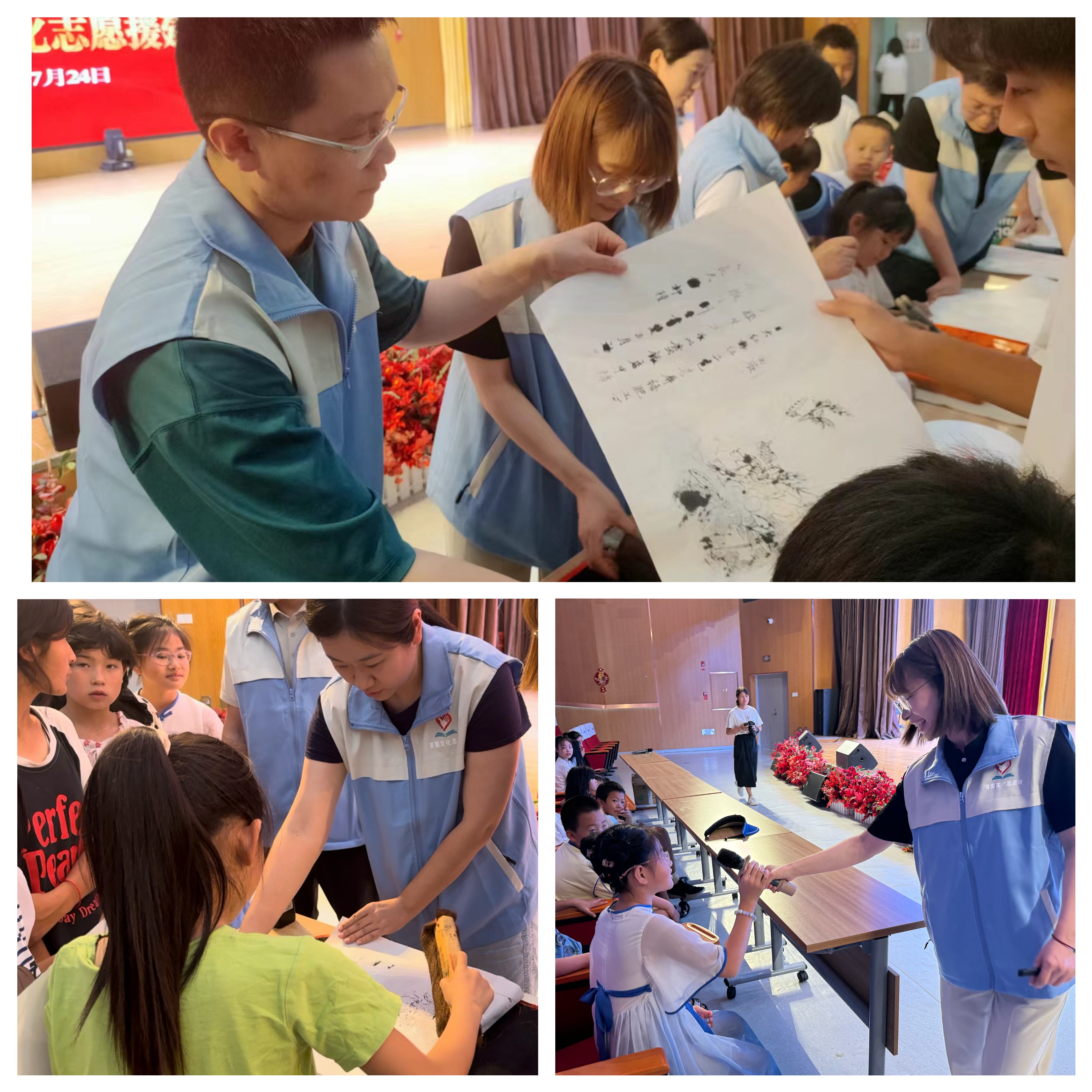 在首都图书馆专家志愿者为小读者开展故事会《成语猜猜猜》后,三地志愿者合作举办了一场面向当地职工孩子的雕版印刷体验活动。孩子们按照志愿者们引导的步骤一步一步地操作,刷墨、铺纸、棕擦刷纸,每一步都小心翼翼,第一幅不够满意再来一幅。孩子们专心致志,精益求精。此次活动让孩子们近距离地感受了雕版印刷的魅力,丰富其暑假生活的同时,也让传统文化扎根于他们的成长过程中。