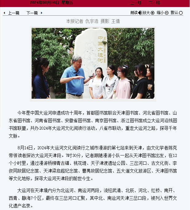 8月16日,天津日报发布《2024年大运河文化阅读行之城市漫游第七站 跟随专家“走读”津城(图)》。