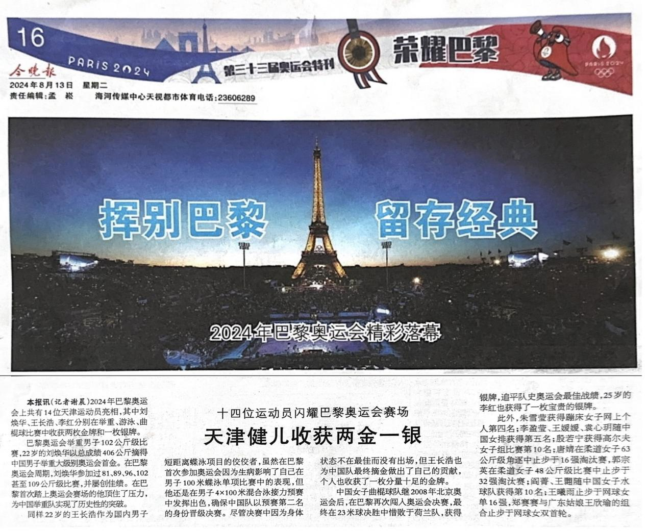 图文 《天津健儿收获两金一银》摘自《今晚报》2024.08.13 第16版