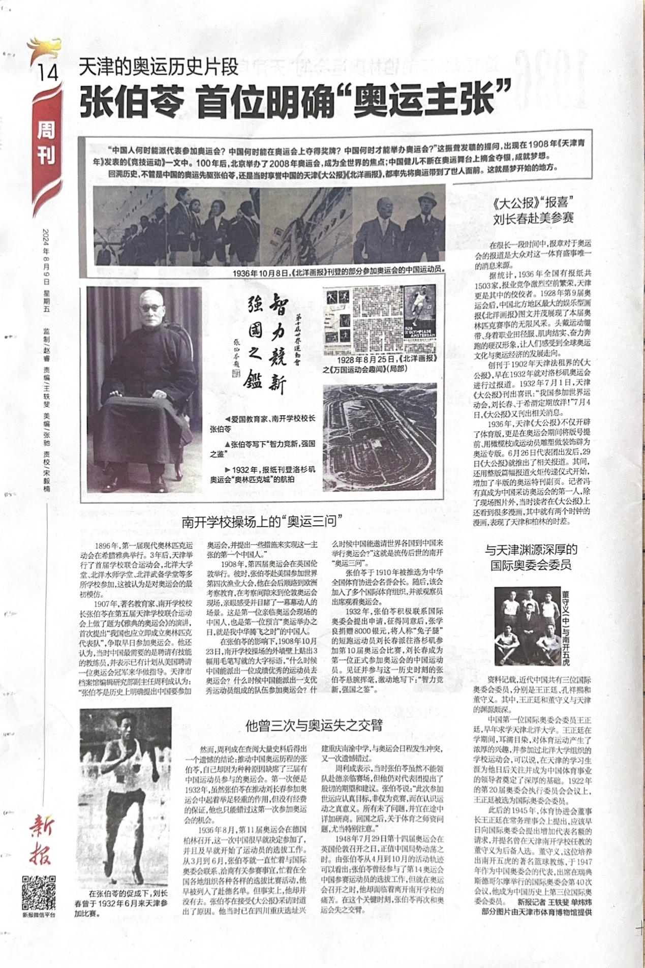 文1 《张伯苓 首位明确“奥运主张”》摘自《每日新报》2024.08.09 第14版