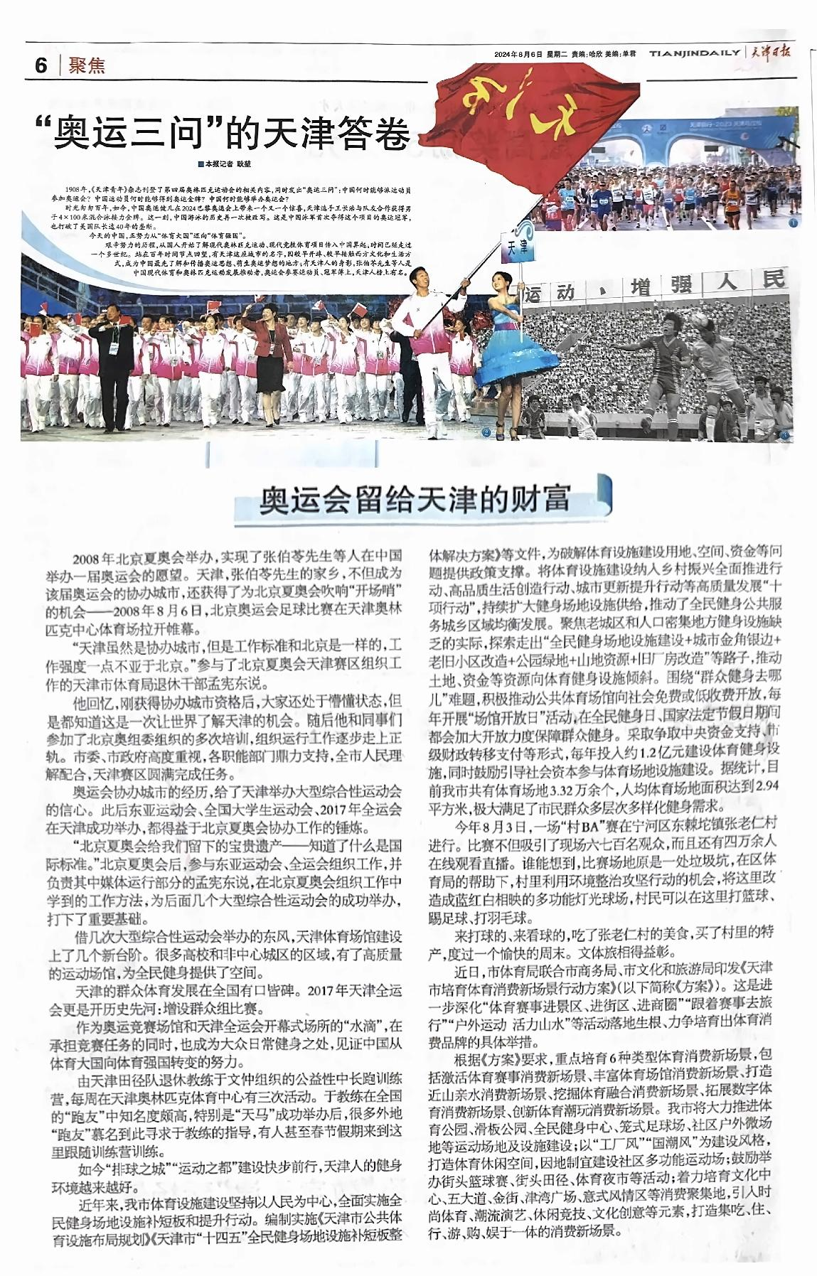 文2《奥运会留给天津的财富》摘自《天津日报》2024.08.06第06版