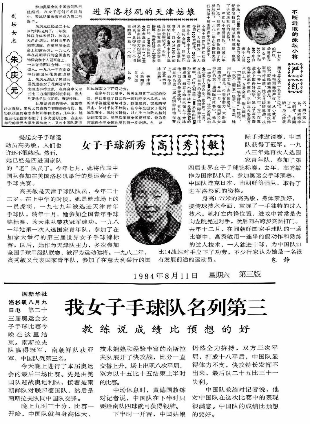 文1《进军洛杉矶的天津姑娘:朱庆元、严红、高秀敏》摘自《天津日报》1984.06.29 第03版