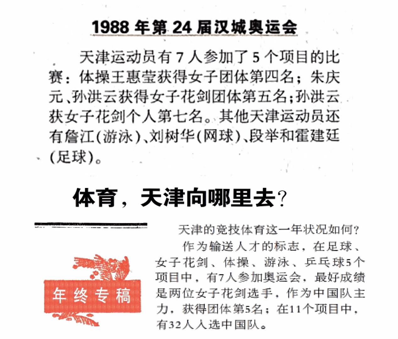 文1《1988年第24届汉城奥运会》节选自《揽金夺银 那些年我们一起追过的天津奥运英雄》摘自《天津日报》2016.08.01 第07版