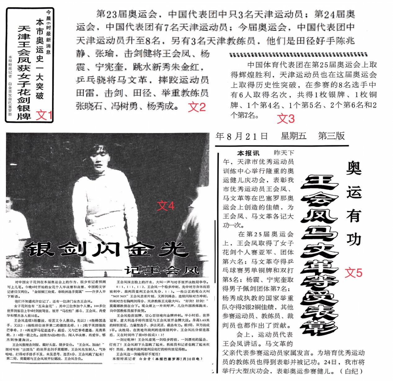 文1 《天津王会凤获女子花剑银牌》摘自《天津日报》1992.07.31 第03版