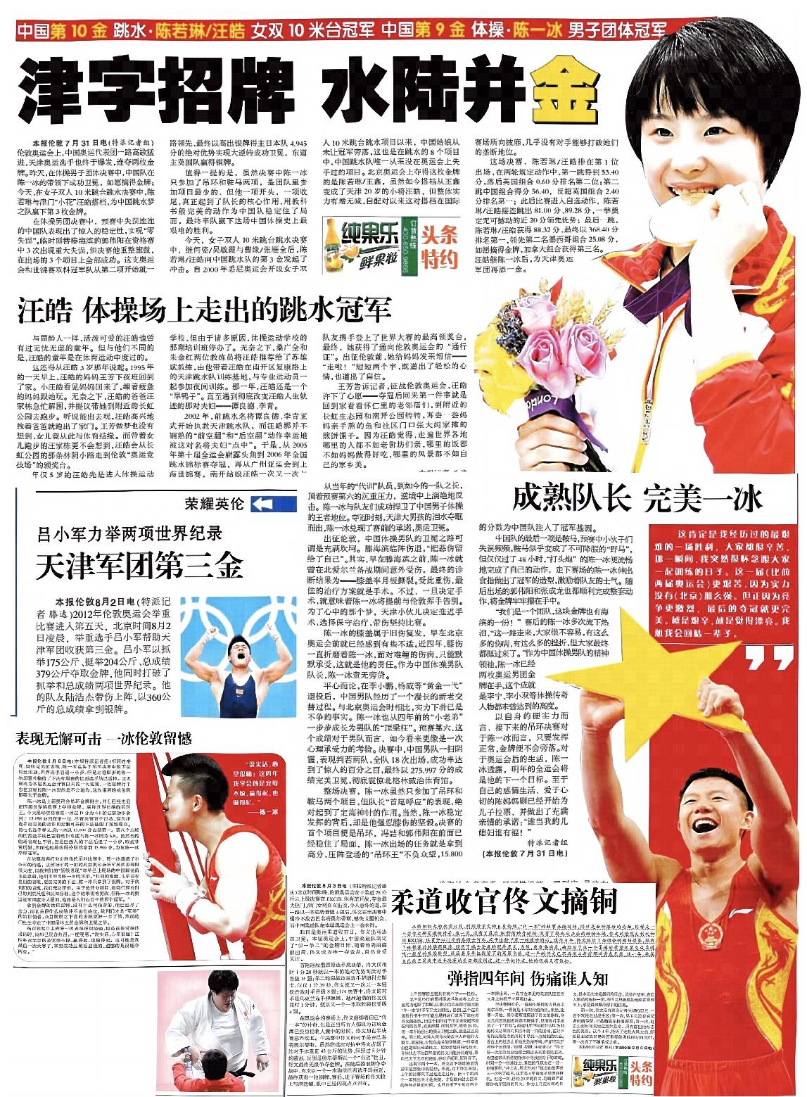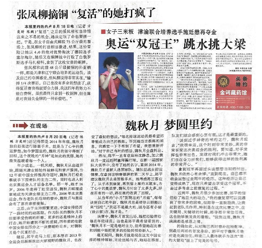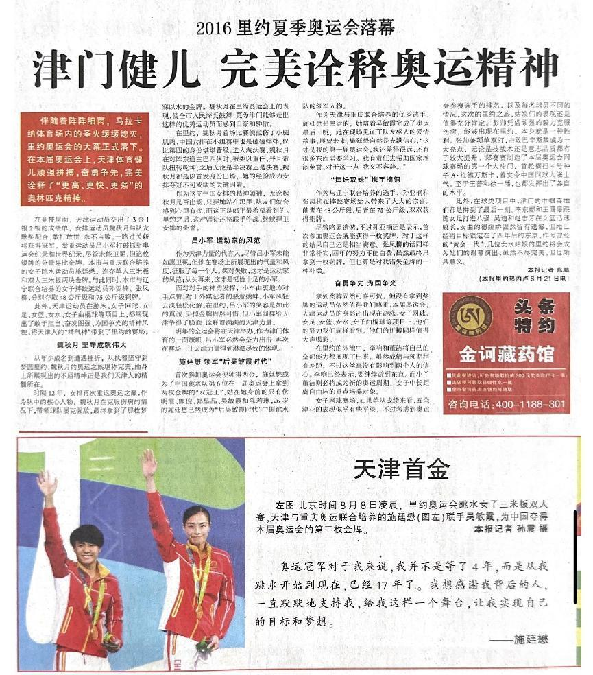 文2 《奥运“双冠王”跳水挑大梁》摘自《天津日报》2016.08.16 第06版