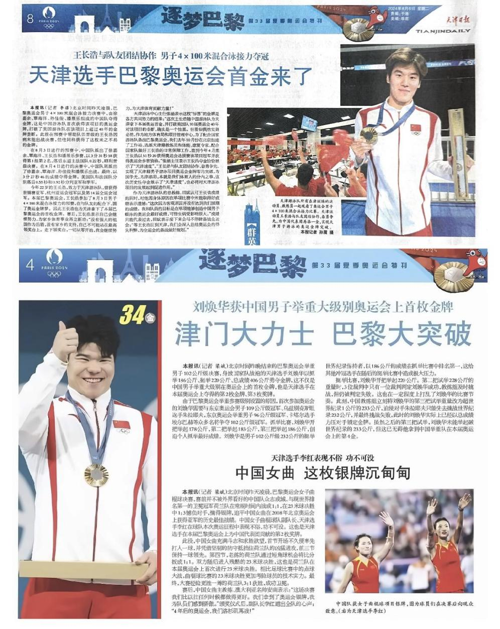 文2 《津门大力士 巴黎大突破》文3《中国女曲 这枚银牌沉甸甸》摘自《天津日报》2024.08.11 第04版