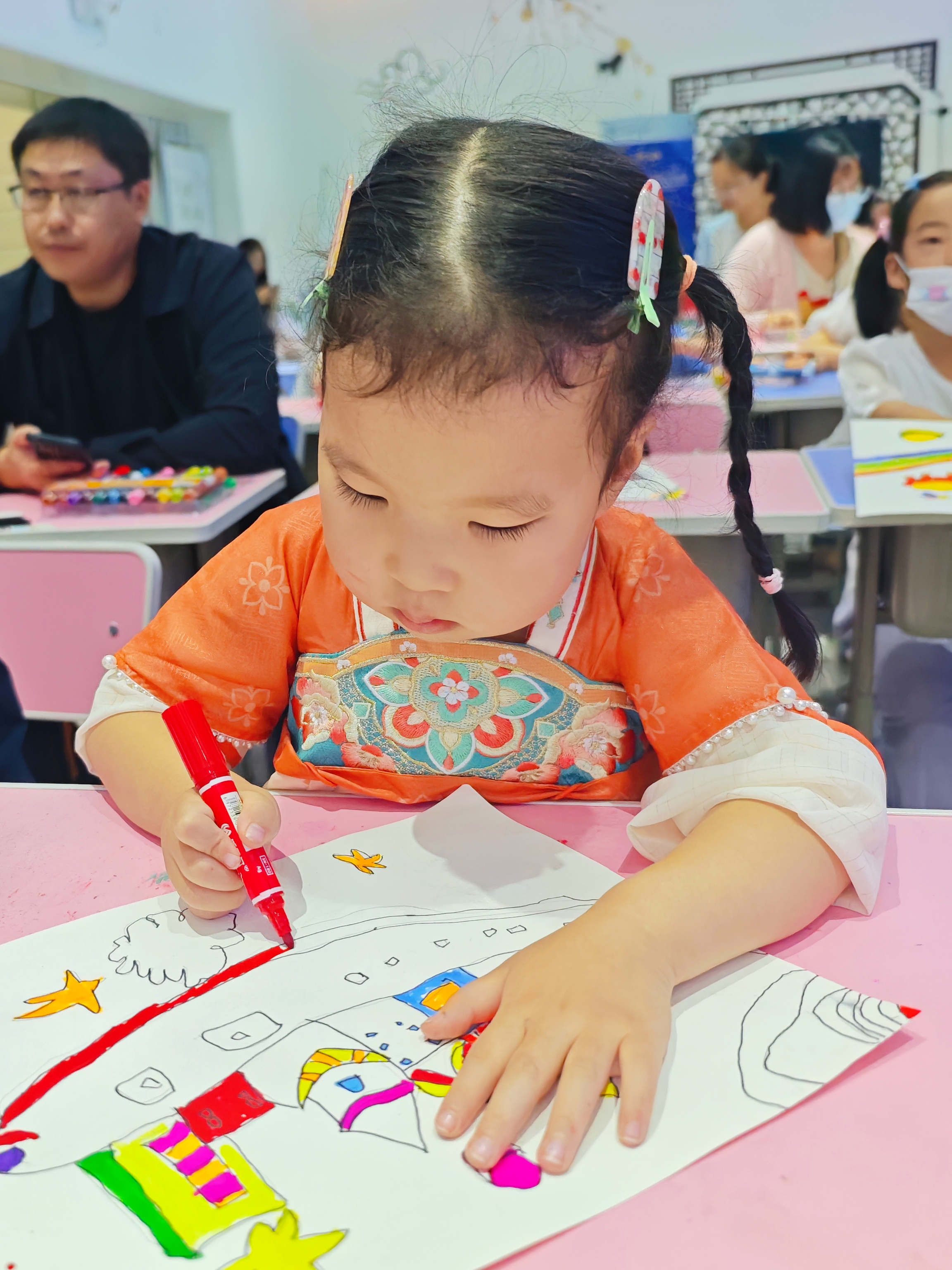 活动开始,馆员老师先向小读者展示了示范画,然后在白板上以简笔画的形式,带领小读者铅笔起稿,再用勾线笔勾线,描画出未来城市的楼房、轻轨在天空中穿梭,宇航员探索于各个星球,火箭化作金鱼翱翔天际,舷窗如同鳞片熠熠闪光的奇妙景象。在老师的引导和启发下,小读者也纷纷展开天马行空的想象,在画纸上尽情释放创意,展现自己对未来城市的憧憬和独特的想法。