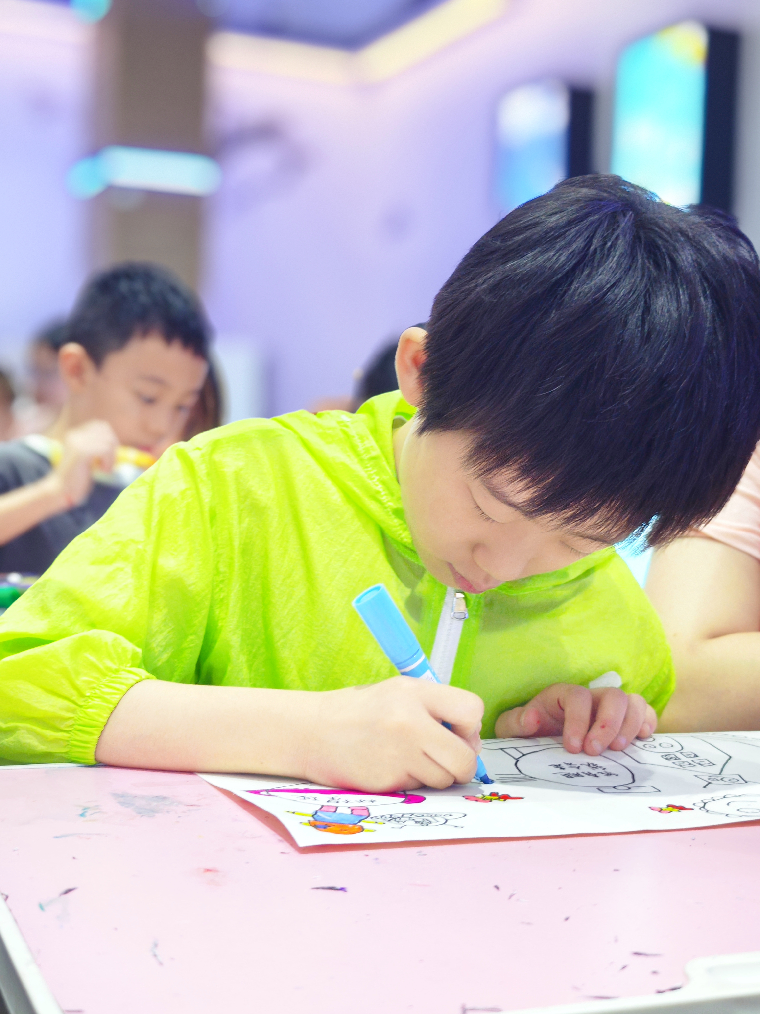在绘画过程中,馆员老师不断走到小读者身边进行交流指导。家长和孩子协同作画,创作出各式各样的绚丽图画。活动最后,小读者们兴高采烈地举着自己的作品合影留念,一起喊出了“遇见科普,点亮梦想”的响亮口号。