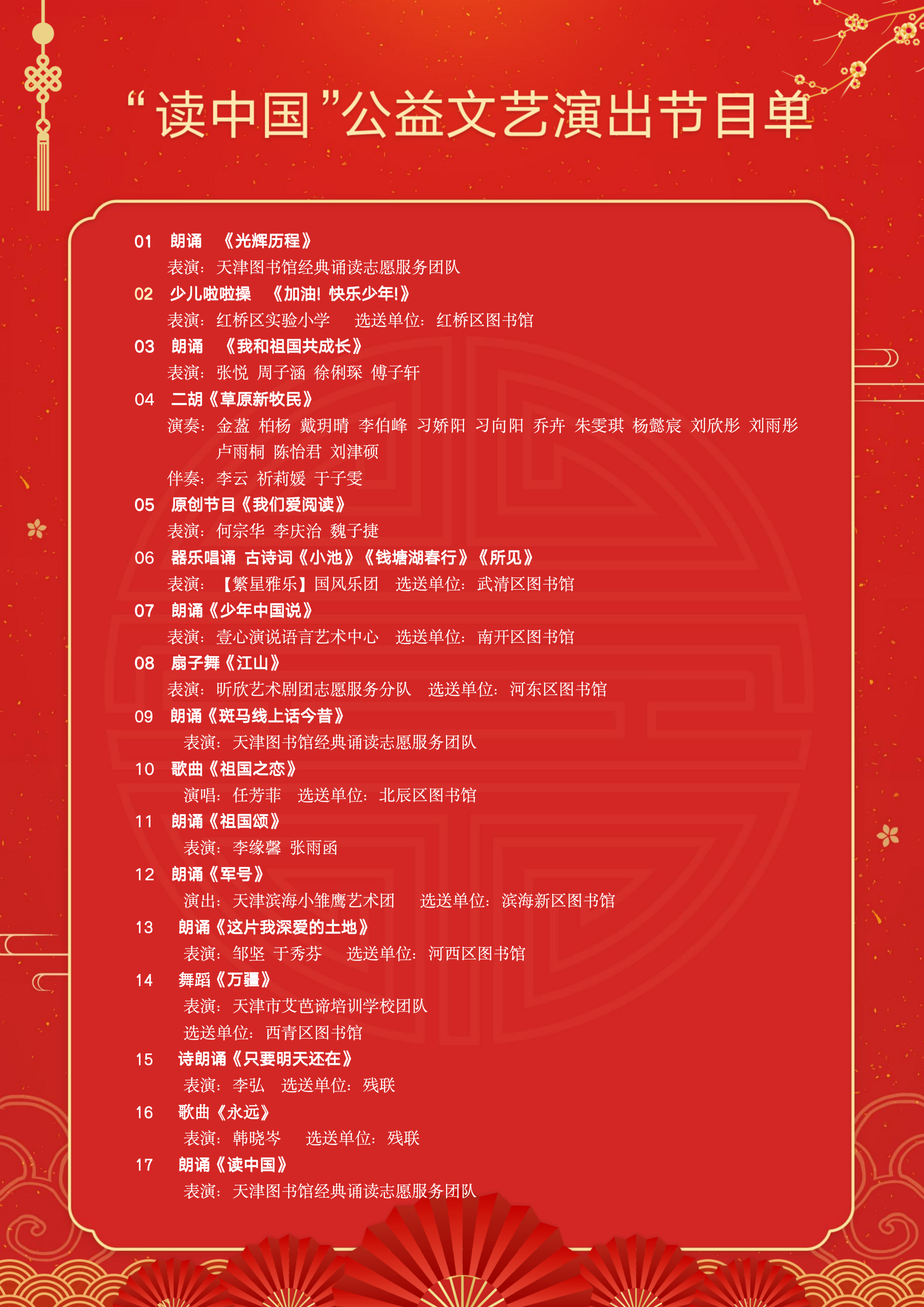 为隆重庆祝中华人民共和国成立75周年,发挥全民阅读核心阵地作用,着力推动以文化人、以文惠民、以文润城、以文兴业,在天津市文化和旅游局的指导下,10月3日15:00点,天津图书馆将在天开高教科创园核心区举办“读中国”公益文艺演出,与市民同抒爱国情,奋进新征程,共筑中国梦,欢度国庆节。