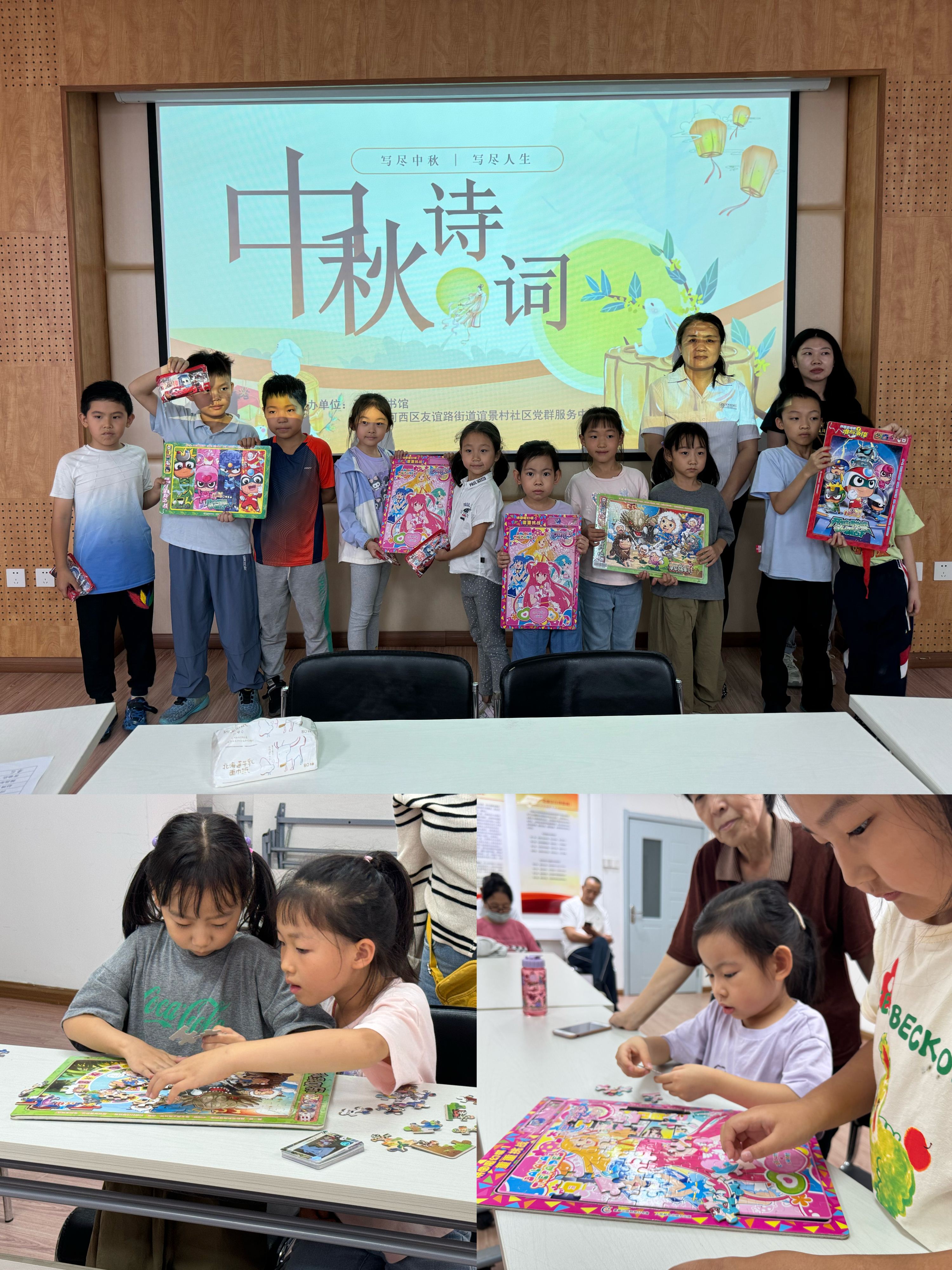 天津图书馆为谊景村辖区的小学生带来了两场以“中秋”为主题的活动。馆员老师为小朋友们讲解了中秋的来历及习俗,小朋友们听得津津有味,积极回答老师提出的互动问题。在猜一猜环节中,小朋友们能够非常迅速地把带有中秋含义的诗句挑出来,并能够自信朗诵出来。现场书香气息十分浓郁。最后同学们根据阅读,自创了带有中秋含义的拇指画、完成了中秋拼图,将中秋祝福送给自己最爱的家人。