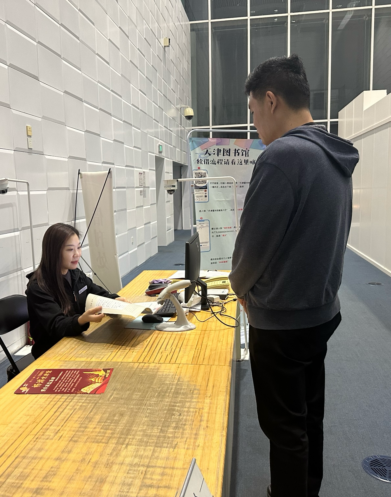 作为公共图书馆的服务前沿,综合咨询台馆员始终保持饱满的精神状态,耐心、细致地接听读者来电,解答现场读者咨询,为读者和天图之间架起“连心桥”。考虑到假日读者办证需求激增,业务组提前准备了应急预案,现场由专人疏导、快速办结,有效减少读者等候时间,真正做到将读者“获得感”“体验感”作为第一标准,以有温度的贴心服务展现图书馆人的良好精神风貌。