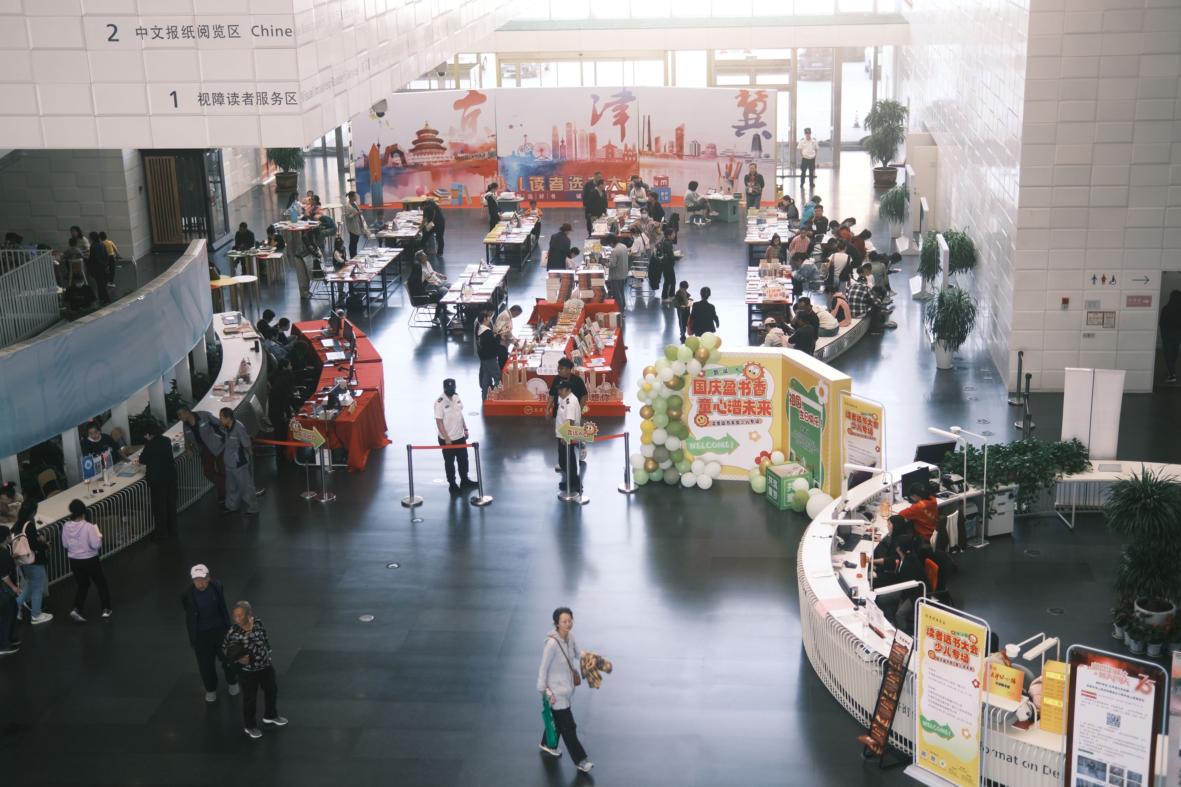 十一假期,天津图书馆以“金秋颂歌 书香爱国”为主题推出59场文化活动以飨读者。来自不同部门的馆员协同配合,共同为营造假日图书馆的浓厚文化氛围而担当奉献。