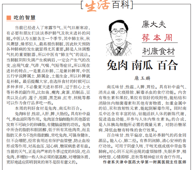 《兔肉 南瓜 百合》摘自《天津日报》2013年10月16日 第15版