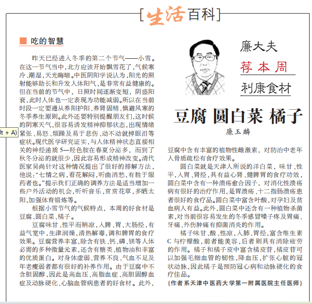 文4《小雪节气寒气渐盛 养阳御寒冬藏进补》摘自《今晚报》2019.11.22第11版