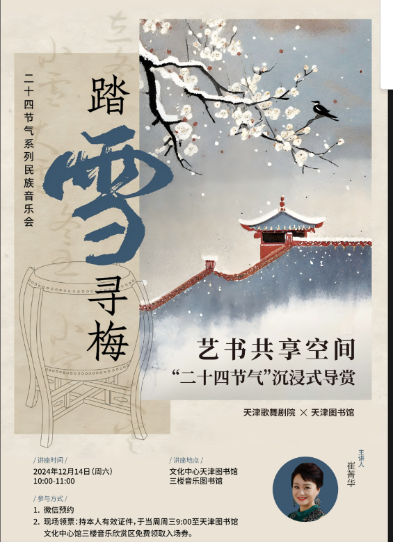 内容简介:二十四节气源于黄河流域,是古代农耕文明的产物。在共享空间,天津歌舞剧院民族乐团的艺术家们将通过现场演绎片段与讲解导赏相结合的方式,与读者进行亲密接触,以文化人,以文润城,传承传统文化,讲述中国故事。