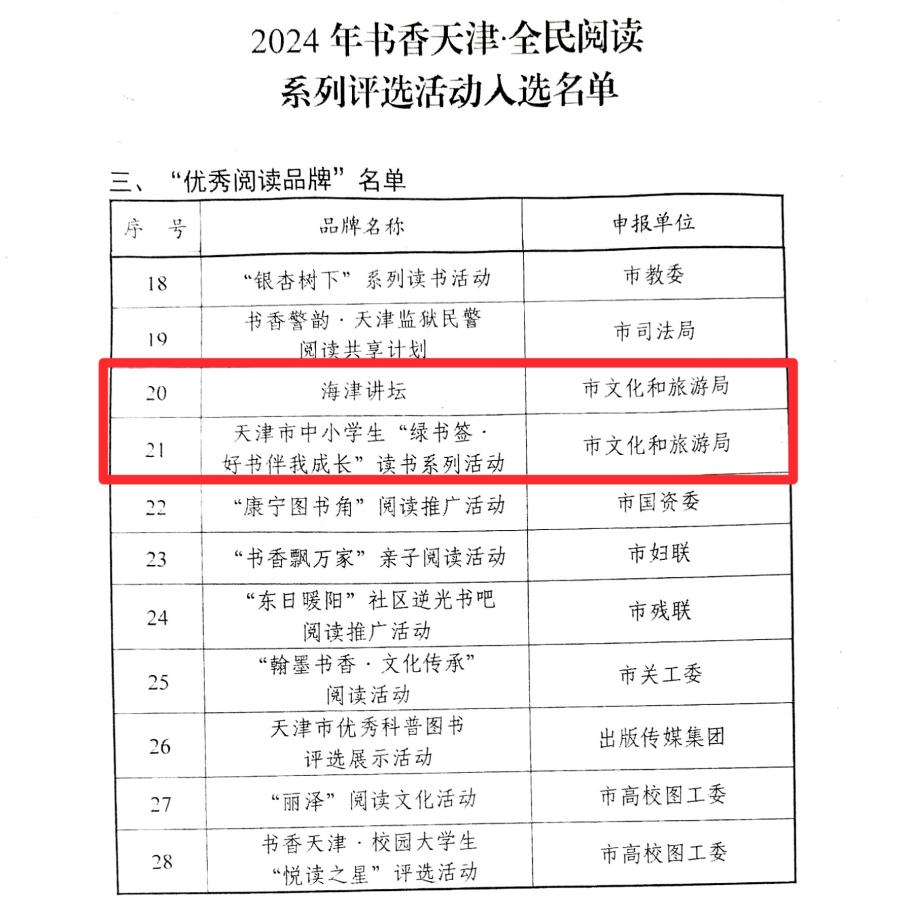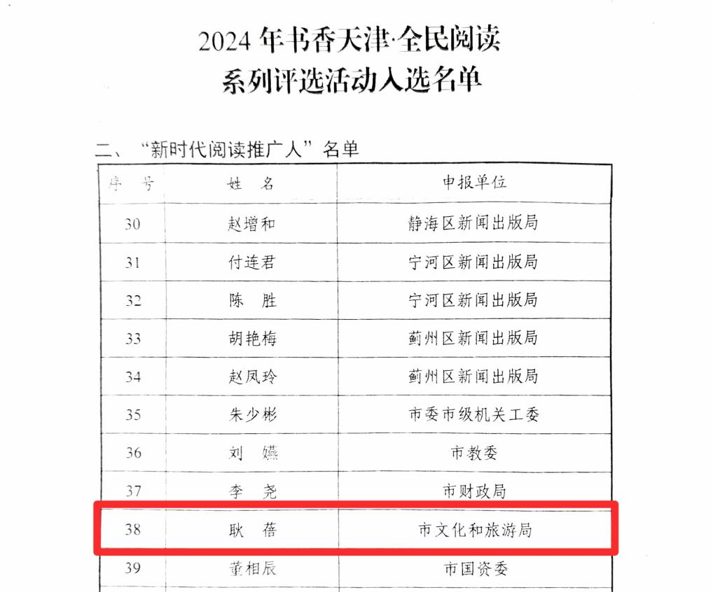 日前,2024年书香天津·全民阅读系列评选名单公布,市文化和旅游局推荐申报的天津图书馆海津讲坛、天津市中小学生“绿书签·好书伴我成长”读书系列活动入选“优秀阅读品牌”名单,耿蓓同志入选“新时代阅读推广人”名单。