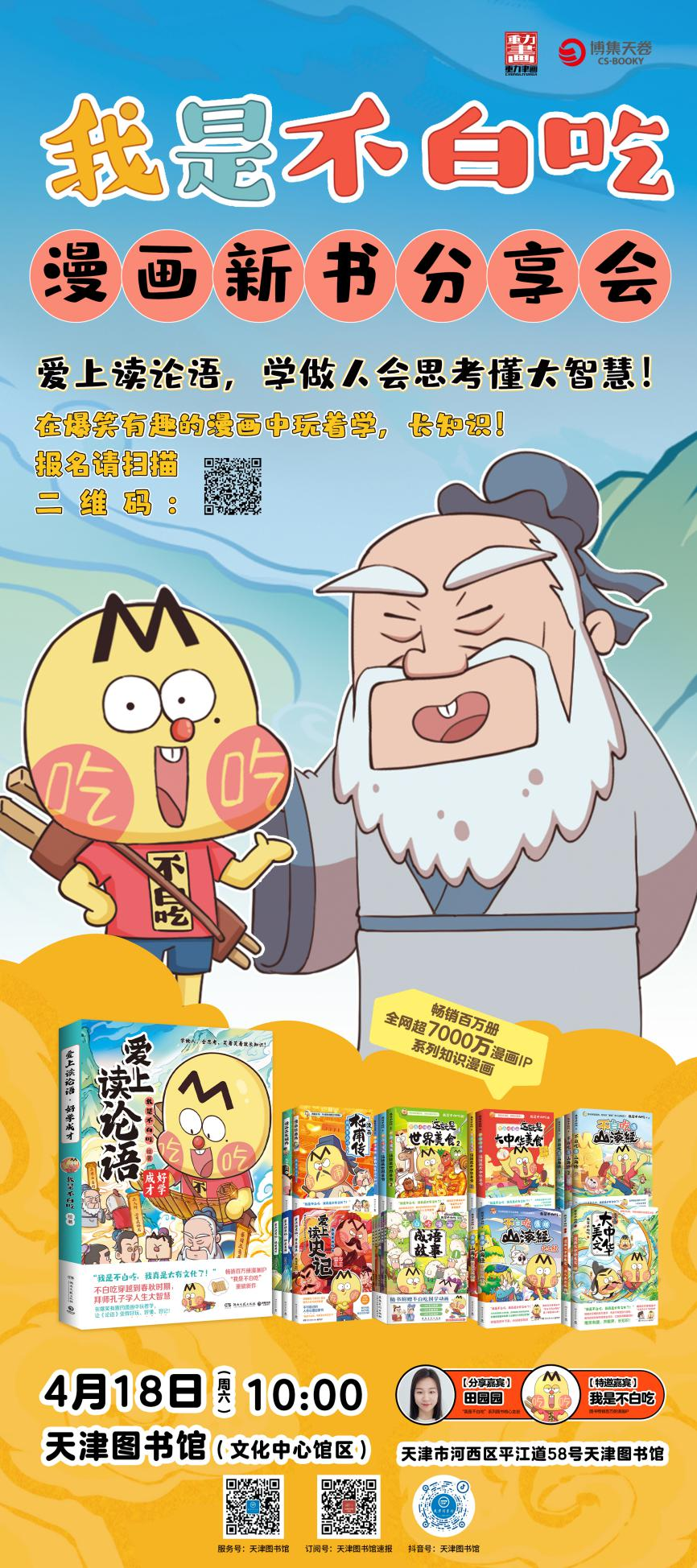 读者关注“天津图书馆速报”微信公众号,扫描下方二维码,即可进行报名。活动招募|我是不白吃,漫画新书分享会爱上读论语,跟孔子学人生大智慧!