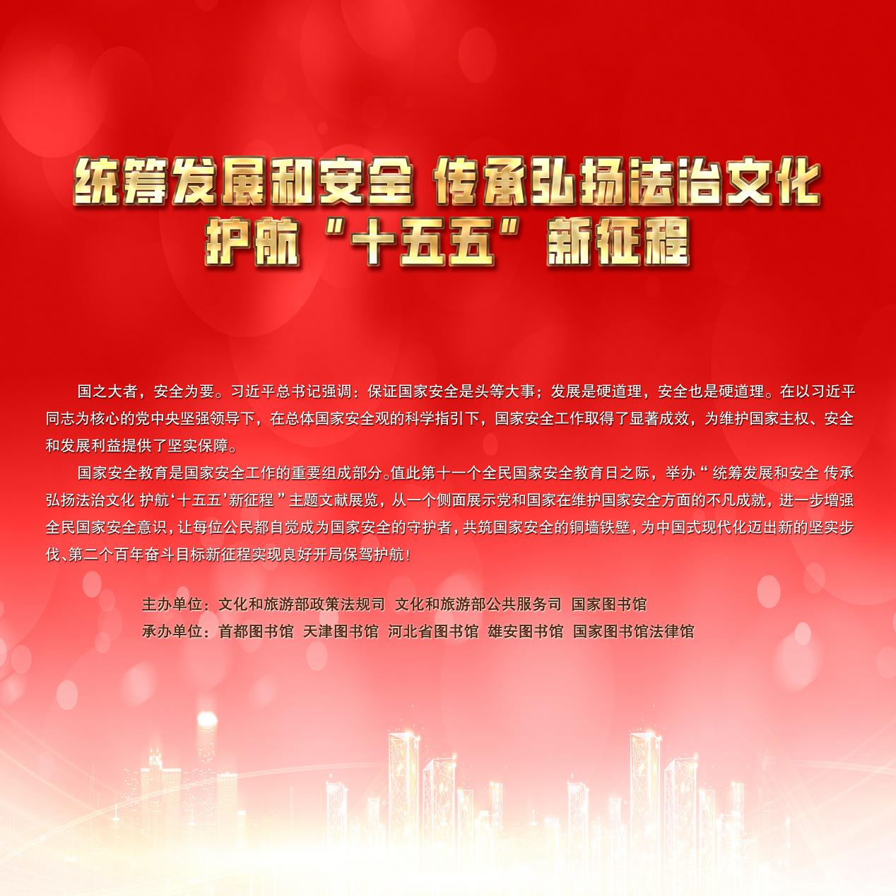 为迎接第十一个全民国家安全教育日,深入践行总体国家安全观,国家图书馆联合首都图书馆、天津图书馆、河北省图书馆、雄安图书馆共同举办的“统筹发展和安全 传承弘扬法治文化 护航‘十五五’新征程”国家安全主题展,在天津图书馆文化中心馆区一楼展厅正式拉开帷幕。展览将持续至5月10日,面向社会公众普及国家安全知识与法治文化。