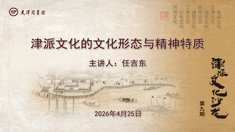 在第31个世界读书日暨首个全民阅读活动周来临之际,天津图书馆精心筹备的“津派文化沙龙”系列活动第九期——《津派文化的文化形态与精神特质》将于2026年4月25日开讲。本次文化沙龙将继续邀请天津社会科学院历史研究所所长、研究员任吉东先生作为主讲人,在延续首场对河海、红色、工商、建筑四大文化形态解读的基础上,聚焦民俗、演艺、文博、休闲四种文化形态,深入剖析其基本内涵外延和所体现的精神气质,完整解码津派文化的八大脉络。
