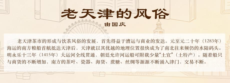 因此,天津人有“一天三遍茶”的习俗,这种独特的茶文化,与天津特殊的地理环境密不可分。天津卫水系发达,运河航运与海运便利,清代中期,便一跃成为北方三大茶叶集散中心之一,南方的茶叶顺着水路源源不断涌入津门。