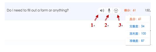 点击下图按钮1、2、3可分别进行收听原音、跟读录音及回放录音,读者可通过按钮2进行多次跟读(提示:录音时,请先点击按钮2,录音完成后,再点击一次按钮2方可结束;为保证英文朗读的评测效果,建议选手佩戴耳麦)。