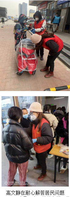 典藏咨询支部党员李秋颖,主动向社区申请参加志愿服务,负责第二轮核酸检测秩序维持、健康码查验、注意事项讲解等工作,及时回答居民提出的问题,充分发挥了党员的先锋作用。