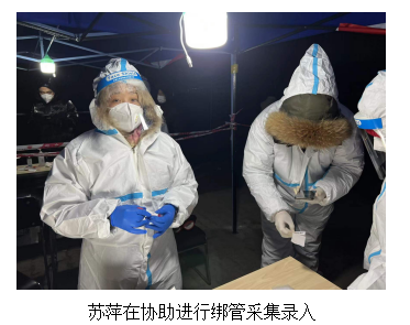1月12日上午十点至13日凌晨一点,苏萍在桃园街连荣里社区市供销社采集点,负责完成了第二次核酸检测的绑管采集录入信息以及维护现场秩序工作。历时15个小时,完成采集工作510例。