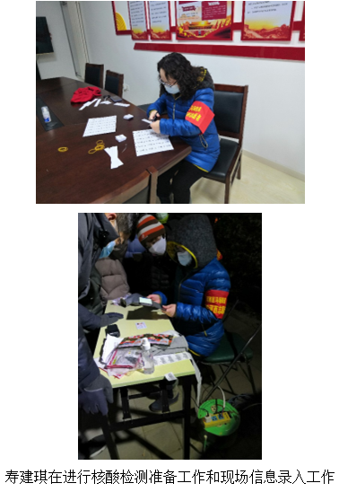 1月12日,寿建琪早早来到居委会参加二筛前期准备工作,并于下午5点到晚上将近11点,在二筛现场为居民进行检测信息预约登记,维护现场秩序。