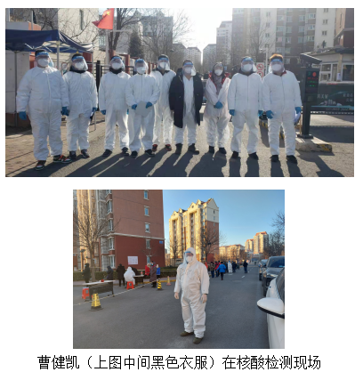 安全保障部党员曹健凯,同样身在管控区,但他不畏艰险,分别于1月11日、1月12日参加了津南区双港新家园新景园社区的第二轮、第三轮核酸检测工作,负责核酸检测秩序维护和身份确认,充分发挥了党员干部的先锋模范作用。